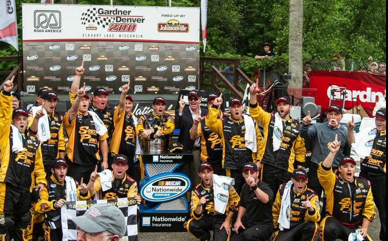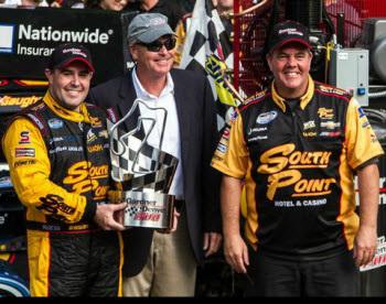 席執(zhí)行官Peter allace為興奮的Brendan Gaughan團(tuán)隊(duì)頒發(fā)了 200大獎(jiǎng)賽獎(jiǎng)杯。這真是一個(gè)特別甜蜜的勝利, 這是98年之后他次嘗試參加NASCAR系列競(jìng)賽。