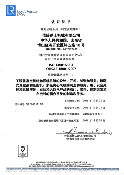 2015年12月,通過勞氏質(zhì)量認證公司對我公司各部門貫徹環(huán)境管理體系、職業(yè)健康安全管理體系的全面審核,一致認定GDNC符合認證要求,運行有效,順利通過了環(huán)境管理和職業(yè)健康安全管理2項體系審核工作,證明了我公司在工程化真空機組和壓縮機組的設(shè)計、開發(fā)、制造和服務(wù),多級離心風機的制造和服務(wù)上的高質(zhì)量水平,為公司產(chǎn)品在市場上的推廣提供了強有力的保障,提升了公司產(chǎn)品的市場競爭能力。