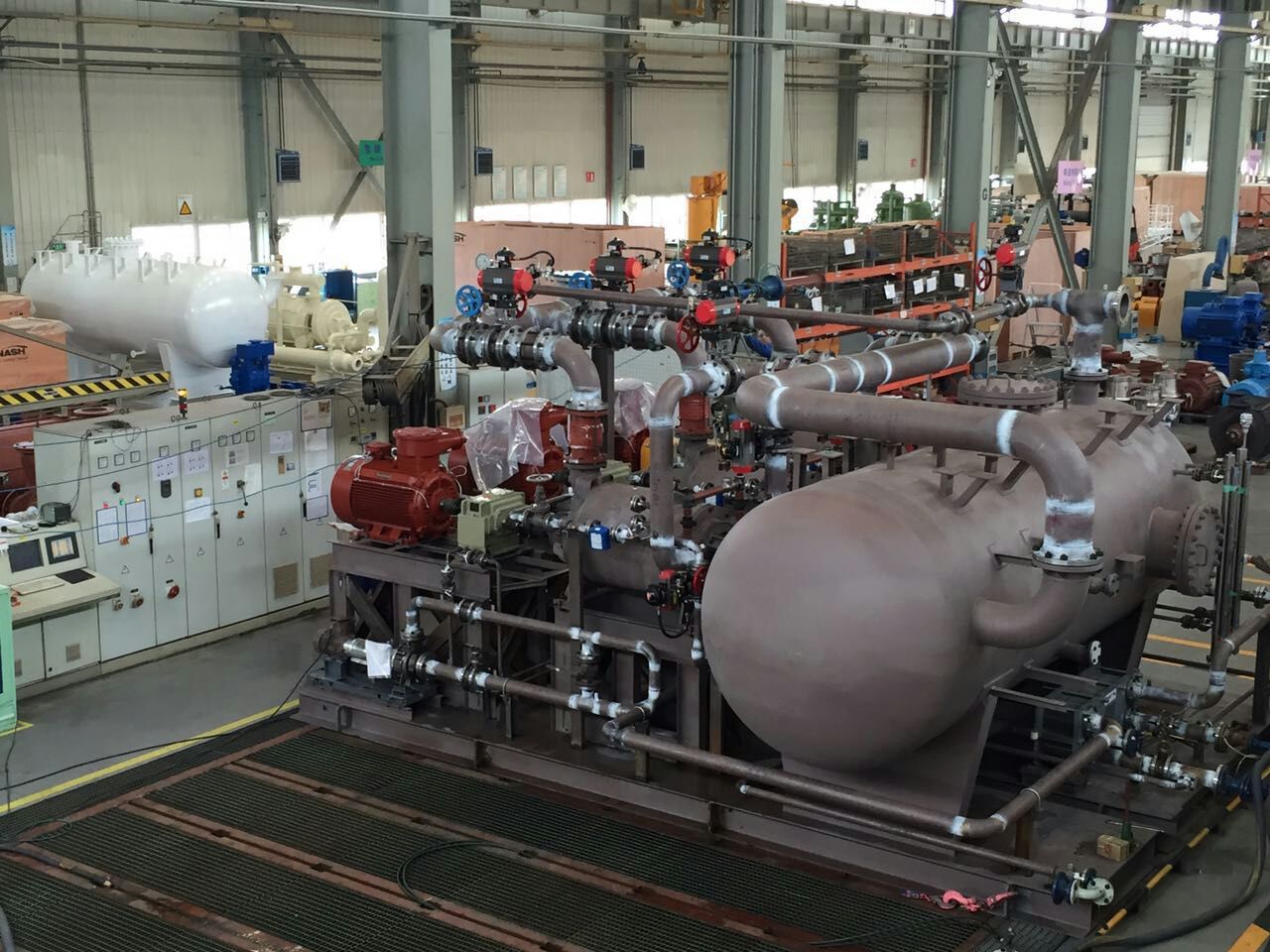 在中化興中油氣回收項目中采用的兩套NASH真空泵系統(tǒng)分別是:一級液環(huán)真空泵系統(tǒng),包括三臺TC系列液環(huán)真空泵可滿足100%工況要求;二級液環(huán)真空泵系統(tǒng),有兩臺TC系列真空泵系統(tǒng)可滿足100%工況要求,一臺泵作為兩級液環(huán)泵系統(tǒng)的備用泵,均可以實現(xiàn)在線自動切換。TC系列的真空泵采用NASH專利技術(shù)錐體設(shè)計:進氣面積大,壓縮比高;封閉式葉輪設(shè)計:耐沖擊性強;NASH專利的GSV技術(shù):吸氣效率高等等。液環(huán)泵系統(tǒng)配置包括液環(huán)泵、防爆電機、出口分離器及工作液冷卻器,相關(guān)的儀表、閥門、連接管路組成閉式循環(huán)系統(tǒng),設(shè)備整體撬裝。