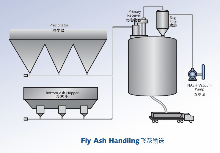 在真空下采用流體輸送方式將飛灰從吸塵器漏斗傳遞到中央干燥收集點(diǎn)。這種傳遞系統(tǒng)的主要優(yōu)點(diǎn)是:由于飛塵在真空下傳遞,任何泄漏都伴隨空氣進(jìn)入,并且飛塵不會(huì)向外排。NASH液環(huán)泵具有承受飛塵進(jìn)入泵內(nèi)的能力,是較佳的選擇的輸送設(shè)備。